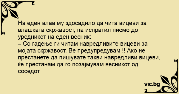 – Со гадење ги читам навредливите вицеви за мојата скржавост. Ве предупредувам !! Ако не престанете да пишувате такви навредливи вицеви, ќе престанам да го позајмувам весникот од соседот.
