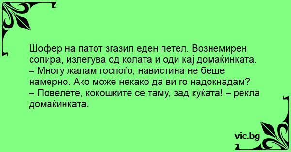 Шофер на патот згазил еден петел. Вознемирен сопира, излегува од колата и оди кај домаќинката.