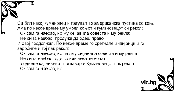 Си бил некој кумановец и патувал во американска пустина со коњ. Ама по некое време му умрел коњот и кумановецот си рекол: