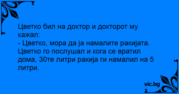 Цветко го послушал и кога се вратил дома, 30те литри ракија ги намалил на 5 литри.