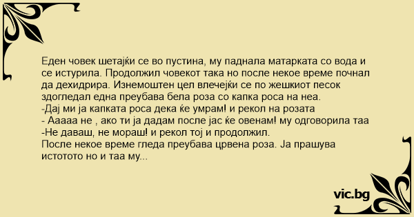 Еден човек шетајќи се во пустина, му паднала матарката со вода и се истурила. Продолжил човекот така но после некое време почнал да дехидрира. Изнемоштен цел влечејќи се по жешкиот песок здогледал една преубава бела роза со капка роса на неа.
