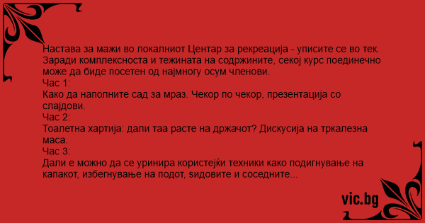 Настава за мажи во локалниот Центар за рекреација - уписите се во тек.