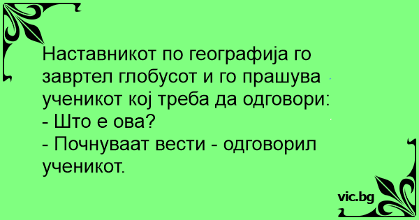 Наставникот по географија го завртел глобусот и го прашува ученикот кој треба да одговори: