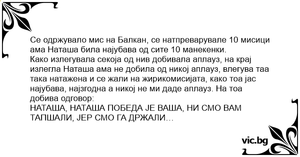 Како излегувала секоја oд нив добивала аплауз, на крај излегла Наташа ама не добила од никој аплауз, влегува таа така натажена и се жали на жирикомисијата, како тоа јас најубава, најзгодна а никој не ми даде аплауз. На тоа добива одговор: