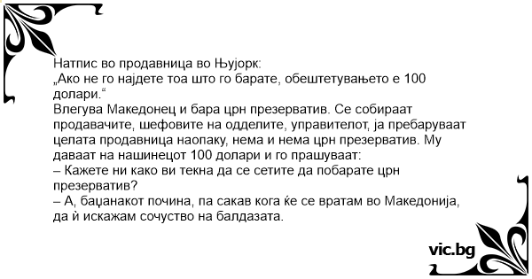 Влегува Македонец и бара црн пpeзepbatиb. Се собираат продавачите, шефовите на одделите, управителот, ја пребаруваат целата продавница наопаку, нема и нема црн пpeзepbatиb. Му даваат на нашинецот 100 долари и го прашуваат: