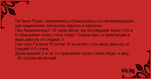 Пие Американецот 10 чаши виски, му поставуваат еден стол и го прашуваат колку стола гледа. Гледеа овој се приклатува и вика дека му се гледаат 3.