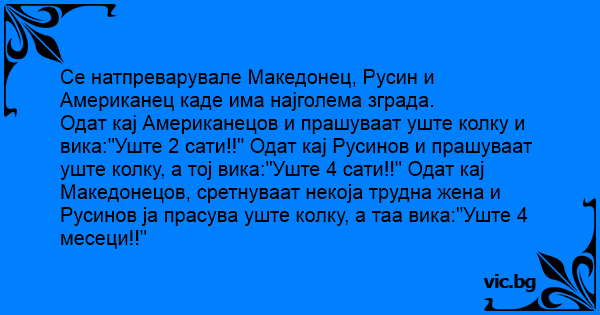 Одат кај Американецов и прашуваат уште колку и вика:"Уште 2 сати!!" Одат кај Русинов и прашуваат уште колку, а тој вика:"Уште 4 сати!!" Одат кај Македонецов, сретнуваат некоја трудна жена и Русинов ја прасува уште колку, а таа вика:"Уште 4 месеци!!"