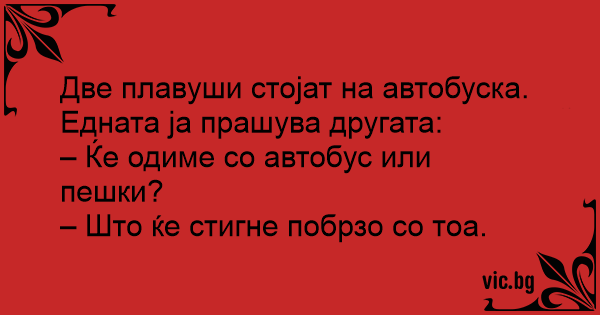 Две плавуши стојат на автобуска. Eдната ја прашува другата: