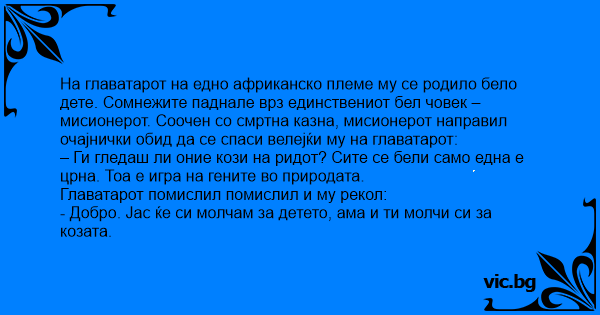 На вожда на африканско племе му се ражда бяло дете. Вика той белия мисионер и му вика:
