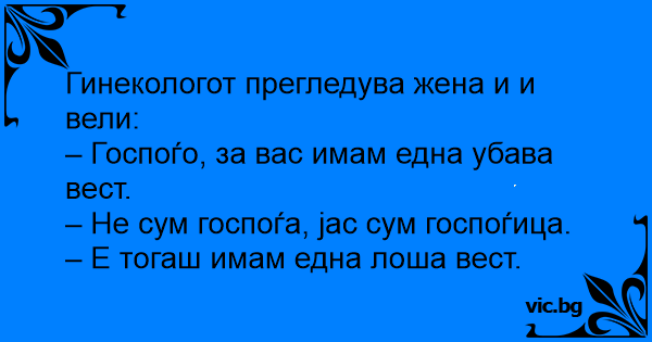 Гінеколог заходить у кабінет, де на нього чекає пацієнтка. — Місіс Браун, маю для вас добру новину. — Лікарю, я “міс”, а не “місіс”. — Міс Браун, маю для вас погану новину.
