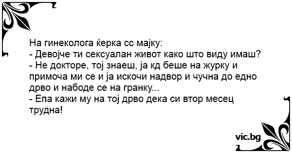 - Не докторе, тој знаеш, ја кд беше на журку и примоча ми се и ја искочи надвор и чучна до едно дрво и набоде се на гранку...