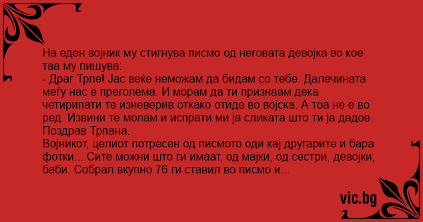 Војникот, целиот потресен од писмото оди кај другарите и бара фотки... Сите можни што ги имаат, од мајки, од сестри, девојки, баби. Собрал вкупно 76 ги ставил во писмо и на него напишал: