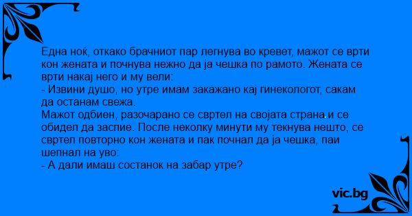 Мажот одбиен, разочарано се свртел на својата страна и се обидел да заспие. После неколку минути му текнува нешто, се свртел повторно кон жената и пак почнал да ја чешка, паи шепнал на уво: