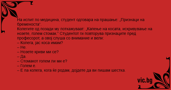 На испит по медицина, студент одговара на прашање: „Признаци на бременоста“.