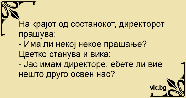 На крајот на состанокот шефот прашува: - Има ли некои прашања??? А работникот: - Имам јас шефе! Да те прашам шефе е*еш ли ти било што, освен нас???