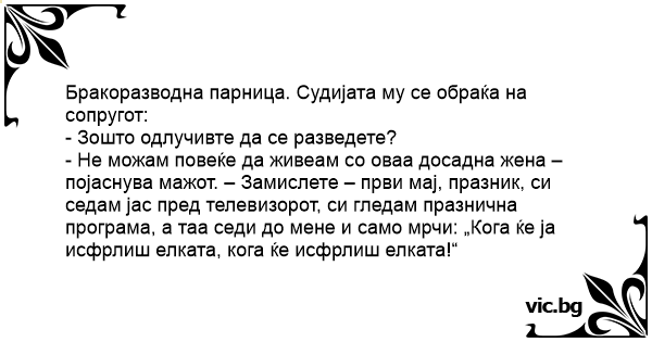 - Не можам повеќе да живеам со оваа досадна жена – појаснува мажот. – Замислете – први мај, празник, си седам јас пред телевизорот, си гледам празнична програма, а таа седи до мене и само мрчи: „Кога ќе ја исфрлиш елката, кога ќе исфрлиш елката!“