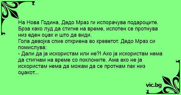 Moş Crăciun intră pe horn într-o casă şi nimereşte în dormitorul unei tinere superbe, care dormea goală în pat. Nehotărît, începe să se plimbe de colo-colo prin încăpere, zicînd: - Dacă o fac, nu...