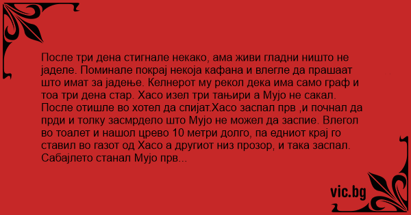 После отишле во хотел да спијат.Хасо заспал прв ,и почнал да прди и толку засмрдело што Мујо не можел да заспие. Влегол во тоалет и нашол црево 10 метри долго, па едниот крај го ставил во газот од Хасо а другиот низ прозор, и така заспал. Сабајлето станал Мујо прв и отишол да пие кафе. После некое време слегол Хасо целиот испотен. Мујо го прашал што му е,а Хасо му одговорил цела ноќ сум прдел па ми излегло газното црево па дур го вратив назад мака си видов.