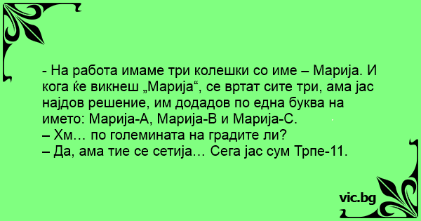- На работа имаме три колешки со име – Марија. И кога ќе викнеш „Марија“, се вртат сите три, ама јас најдов решение, им додадов по една буква на името: Марија-А, Марија-В и Марија-С.