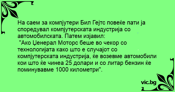 "Ако Џенерал Моторс беше во чекор со технологијата како што е случајот со компјутерската индустрија, ќе возевме автомобили кои што ќе чинеа 25 долари и со литар бензин ќе поминувавме 1000 километри".