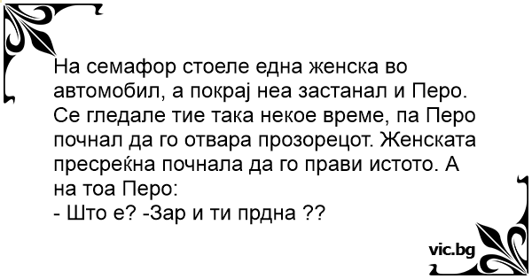 Се гледале тие така некое време, па Перо почнал да го отвара прозорецот. Женската пресреќна почнала да го прави истото. А на тоа Перо:
