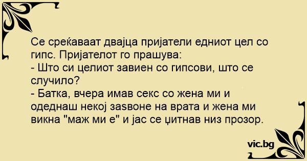 Се среќаваат двајца пријатели едниот цел со гипс. Пријателот го прашува: