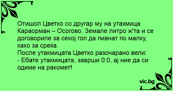 Отишол Цветко со другар му на утакмица Караорман – Осогово. Земале литро ж'та и се договориле за секој гол да пивнат по малку, како за среќа.
