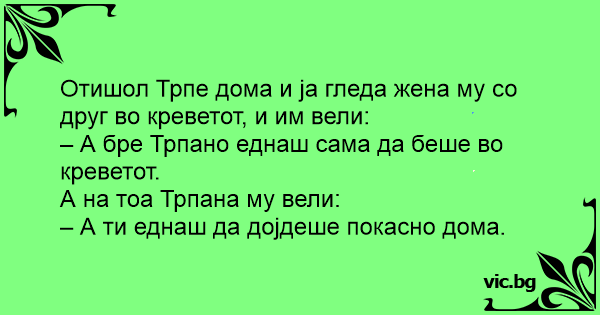 Отишол Трпе дома и ја гледа жена му со друг во креветот, и им вели: