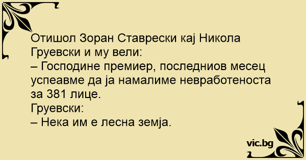 – Господине премиер, последниов месец успеавме да ја намалиме невработеноста за 381 лице.