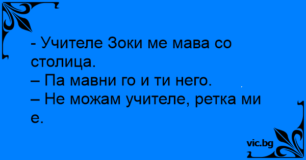 - Учителе Зоки ме мава со столица.<br />– Па мавни го и ти него.<br />– Не можам учителе, ретка ми е.