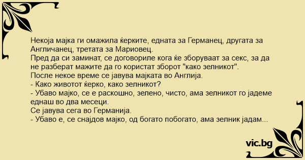 Некоја мајка ги омажила ќерките, едната за Германец, другата за Англичанец, третата за Мариовец.