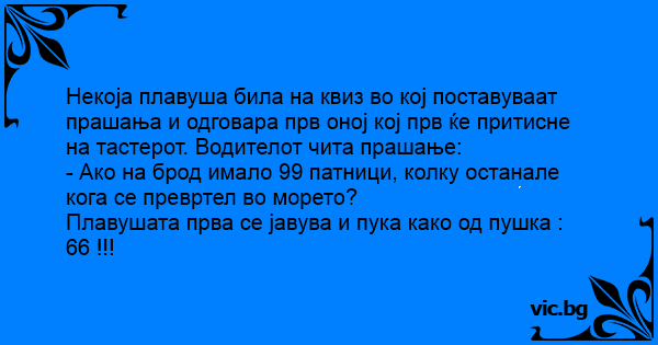 Некоја плавуша била на квиз во кој поставуваат прашања и одговара прв оној кој прв ќе притисне на тастерот. Водителот чита прашање: