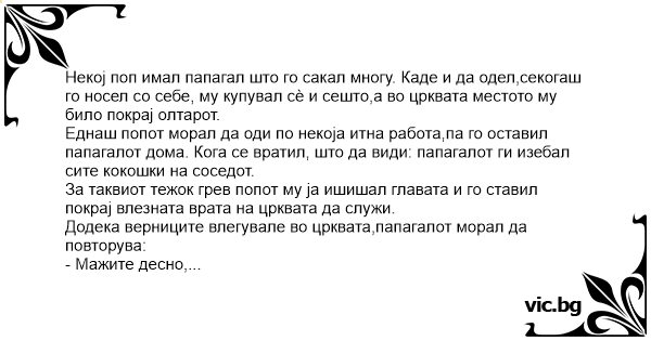 Некој поп имал папагал што го сакал многу. Каде и да одел,секогаш го носел со себе, му купувал сè и сешто,а во црквата местото му било покрај олтарот.