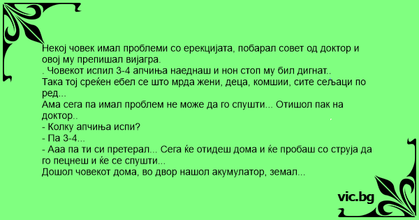 . Човекот испил 3-4 апчиња наеднаш и нон стоп му бил дигнат.. Така тој срeќен ебел се што мрда жени, деца, комшии, сите сељаци по ред... Ама сега па имал проблем не може да го спушти... Отишол пак на доктор.. - Колку апчиња испи? - Па 3-4... - Ааа па ти си претерал... Сега ќе отидеш дома и ќе пробаш со струја да го пецнеш и ќе се спушти... Дошол човекот дома, во двор нашол акумулатор, земал кабли и го пецкал... Некој комшија го вишол како го пецкал и почнал да трча по селото и на цел глас да вика: - БЕГАЈТЕЕЕЕ ЛУЃЕЕЕЕ... ОВОЈ ПАК ГО ПОЛНИИИИ!