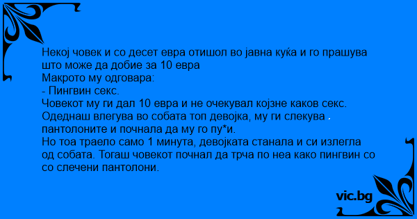 Но тоа траело само 1 минута, девојката станала и си излегла од собата. Тогаш човекот почнал да трча по неа како пингвин со со слечени пантолони.