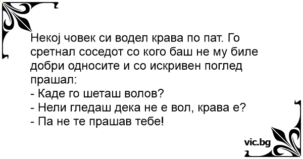 Некој човек си водел крава по пат. Го сретнал соседот со кого баш не му биле добри односите и со искривен поглед прашал: