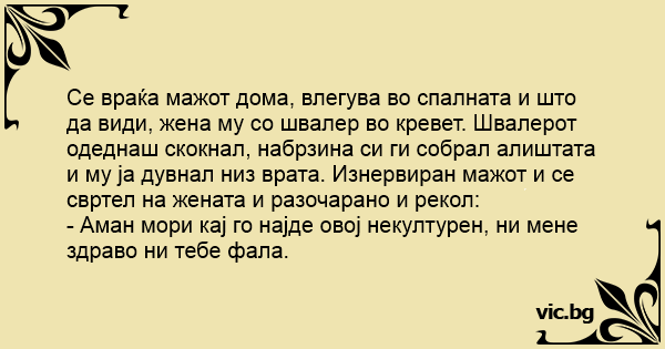 Се враќа мажот дома, влегува во спалната и што да види, жена му со швалер во кревет. Швалерот одеднаш скокнал, набрзина си ги собрал алиштата и му ја дувнал низ врата. Изнервиран мажот и се свртел на жената и разочарано и рекол: