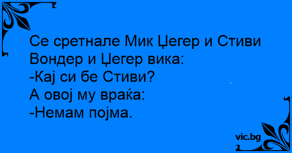 Се сретнале Мик Џегер и Стиви Вондер и Џегер вика: -Кај си бе Стиви? А овој му враќа: -Немам појма.