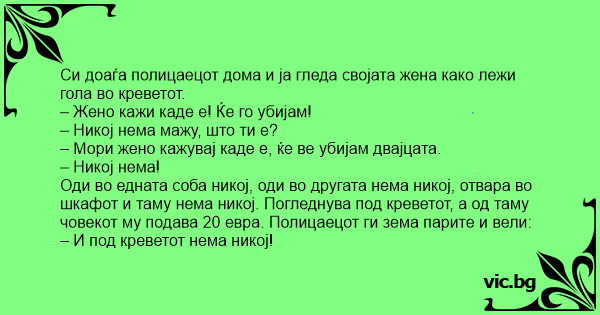 Оди во едната соба никој, оди во другата нема никој, отвара во шкафот и таму нема никој. Погледнува под креветот, а од таму човекот му подава 20 евра. Полицаецот ги зема парите и вели: