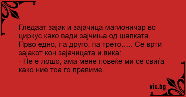 Гледаат зајак и зајачица магионичар во циркус како вади зајчиња од шапката. Прво едно, па друго, па трето….. Се врти зајакот кон зајачицата и вика:
