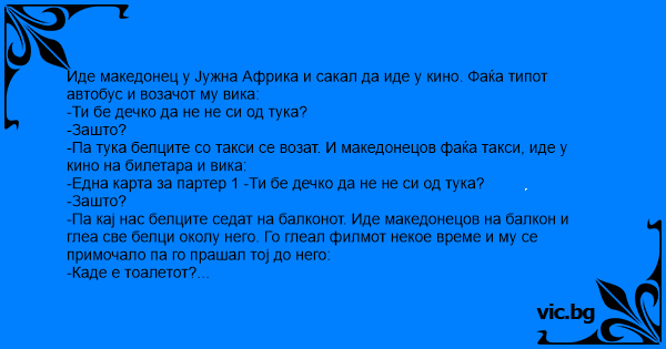 Иде македонец у Јужна Африка и сакал да иде у кино. Фаќа типот автобус и возачот му вика: