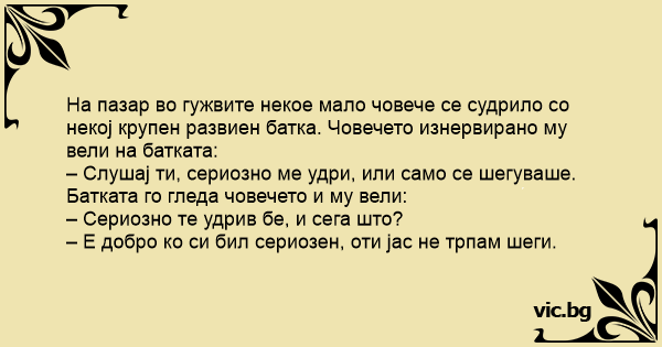На пазар во гужвите некое мало човече се судрило со некој крупен развиен батка. Човечето изнервирано му вели на батката: