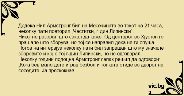 Додека Нил Армстронг бил на Месечината во текот на 21 часа, неколку пати повторил „Честитки, г-дин Липински“.