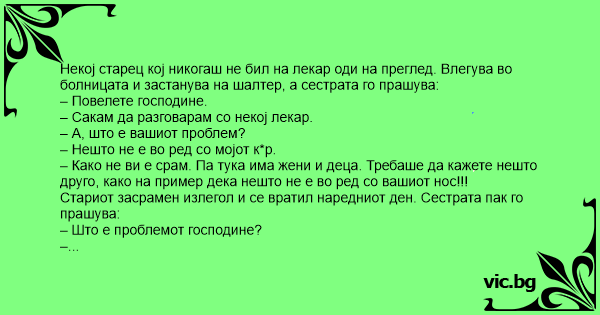 Некој старец кој никогаш не бил на лекар оди на преглед. Влегува во болницата и застанува на шалтер, а сестрата го прашува: