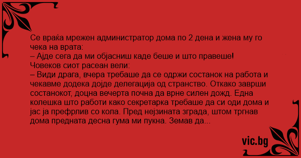 Се враќа мрежен администратор дома по 2 дена и жена му го чека на врата: