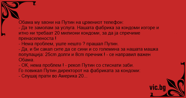 - Да те замолам за услуга. Нашата фабрика за кондоми изгоре и итно ни требаат 20 милиони кондоми, за да ја спречиме пренаселеноста !