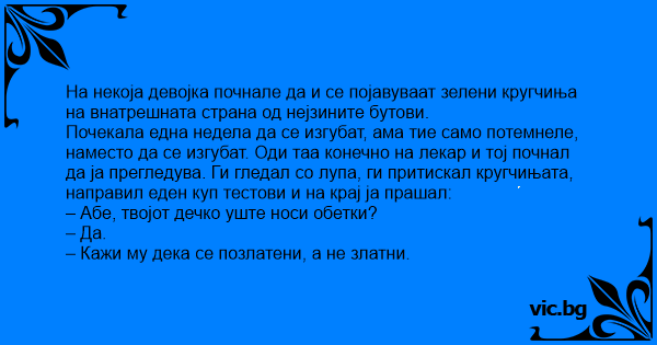 Почекала една недела да се изгубат, ама тие само потемнеле, наместо да се изгубат. Оди таа конечно на лекар и тој почнал да ја прегледува. Ги гледал со лупа, ги притискал кругчињата, направил еден куп тестови и на крај ја прашал: