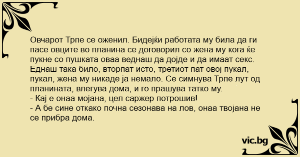Овчарот Трпе се оженил. Бидејќи работата му била да ги пасе овците во планина се договорил со жена му кога ќе пукне со пушката оваа веднаш да дојде и да имаат cekc.