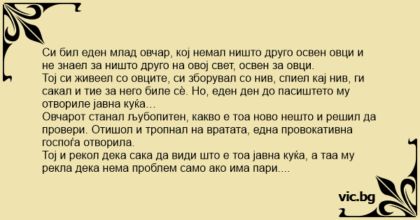 Овчарот станал љубопитен, какво е тоа ново нешто и решил да провери. Отишол и тропнал на вратата, една провокативна госпоѓа отворила.