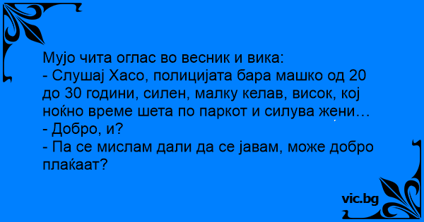 - Слушај Хасо, полицијата бара машко од 20 до 30 години, силен, малку келав, висок, кој ноќно време шета по паркот и силува жени…